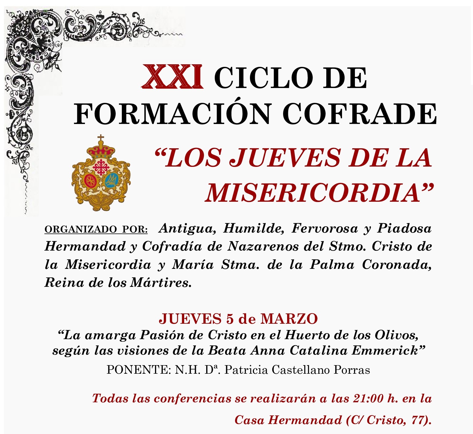 Todas las conferencias se realizarán a las 21:00 h. en la Casa Hermandad (C/ Cristo, 77).