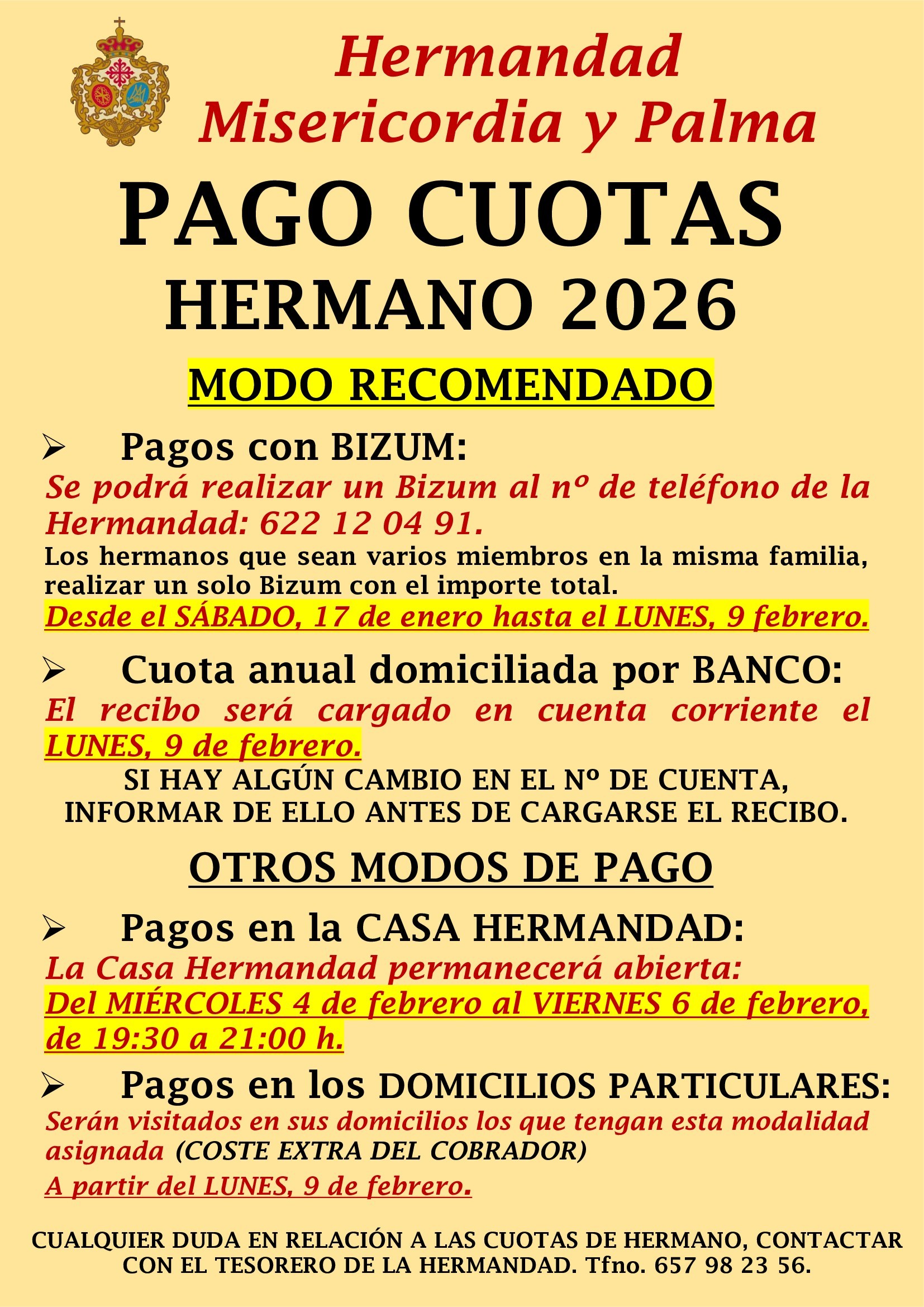 CUALQUIER DUDA EN RELACIÓN A LAS CUOTAS DE HERMANO, CONTACTAR CON EL TESORERO DE LA HERMANDAD. Tfno. 657 98 23 56.