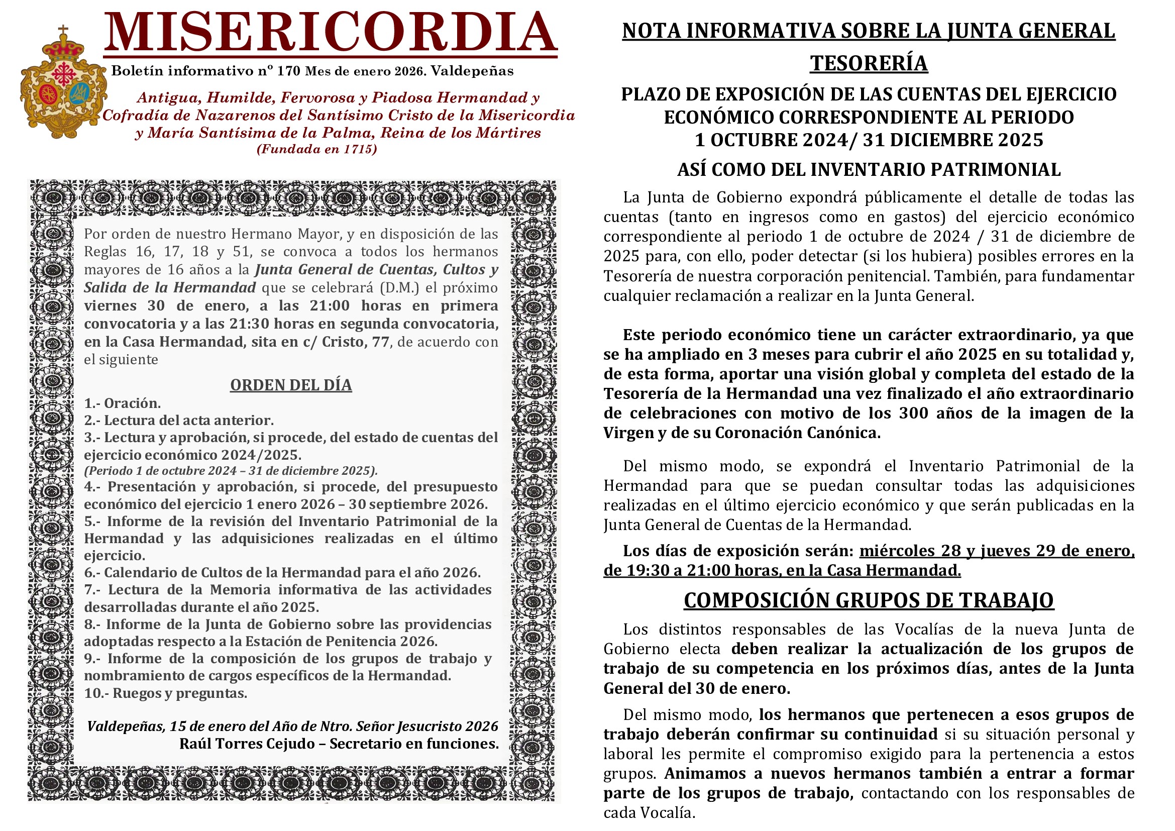 Por orden de nuestro Hermano Mayor, y en disposición de las Reglas 16, 17, 18 y 51, se convoca a todos los hermanos mayores de 16 años a la Junta General de Cuentas, Cultos y Salida de la Hermandad que se celebrará (D.M.) el próximo viernes 30 de enero, a las 21:00 horas en primera convocatoria y a las 21:30 horas en segunda convocatoria, en la Casa Hermandad, sita en c/ Cristo, 77, de acuerdo con el siguiente