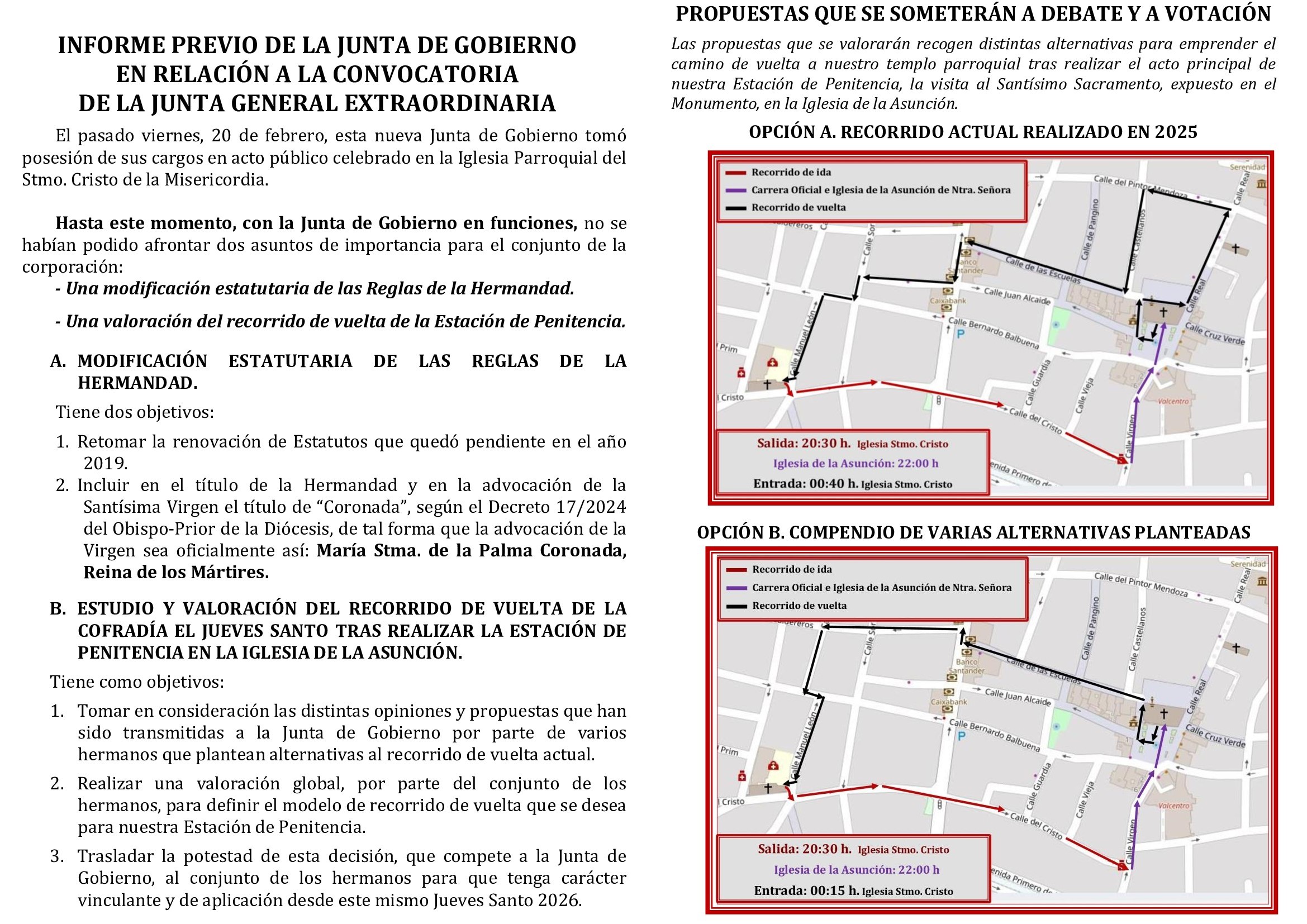 4.- Informe y votación, con carácter vinculante, de las distintas propuestas planteadas para mantener o modificar el recorrido de vuelta de la Estación de Penitencia en la noche del Jueves Santo.