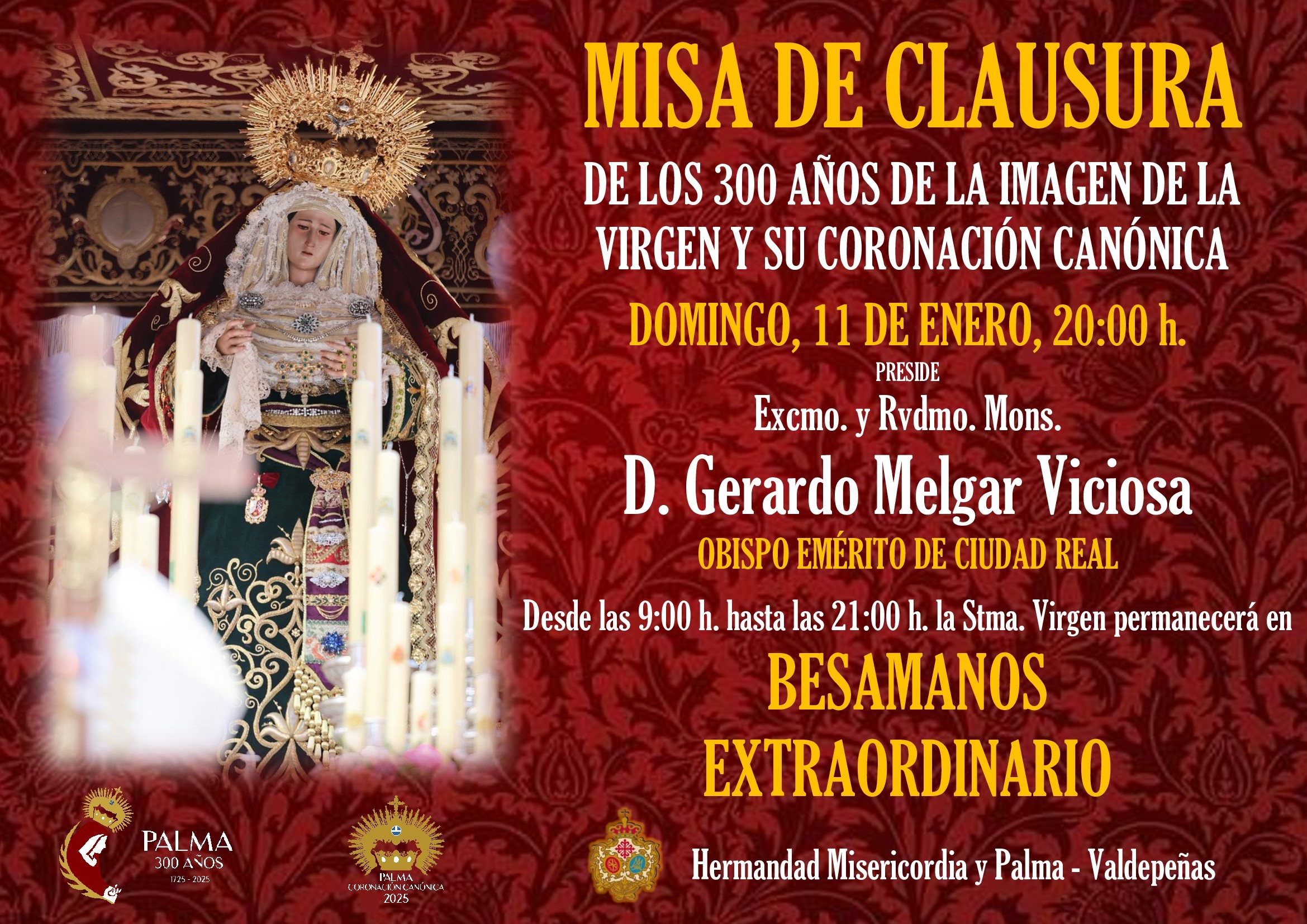 La Junta de Gobierno de la Hermandad informa que la Misa de Clausura de las celebraciones de los 300 años de la imagen de María Stma. de la Palma, Reina de los Mártires, y de su Coronación Canónica, será presidida por el Obispo emérito, Mons. D. Gerardo Melgar Viciosa.