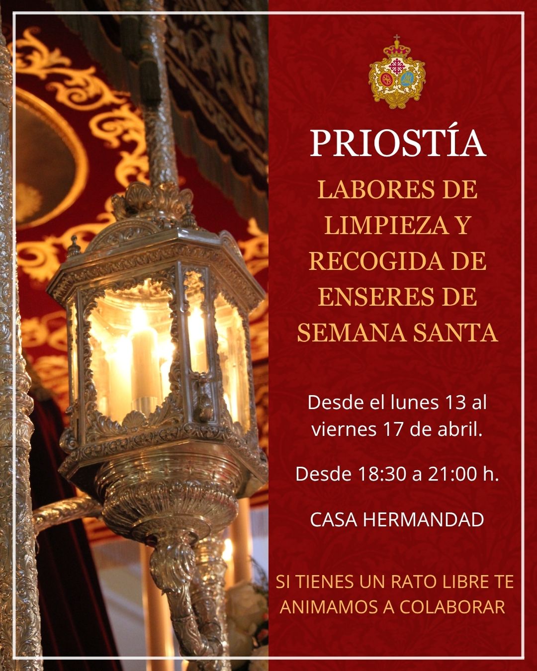 El equipo de PRIOSTÍA informa del inicio de las labores de limpieza y desmontaje de los enseres utilizadas durante la pasada Semana Santa.