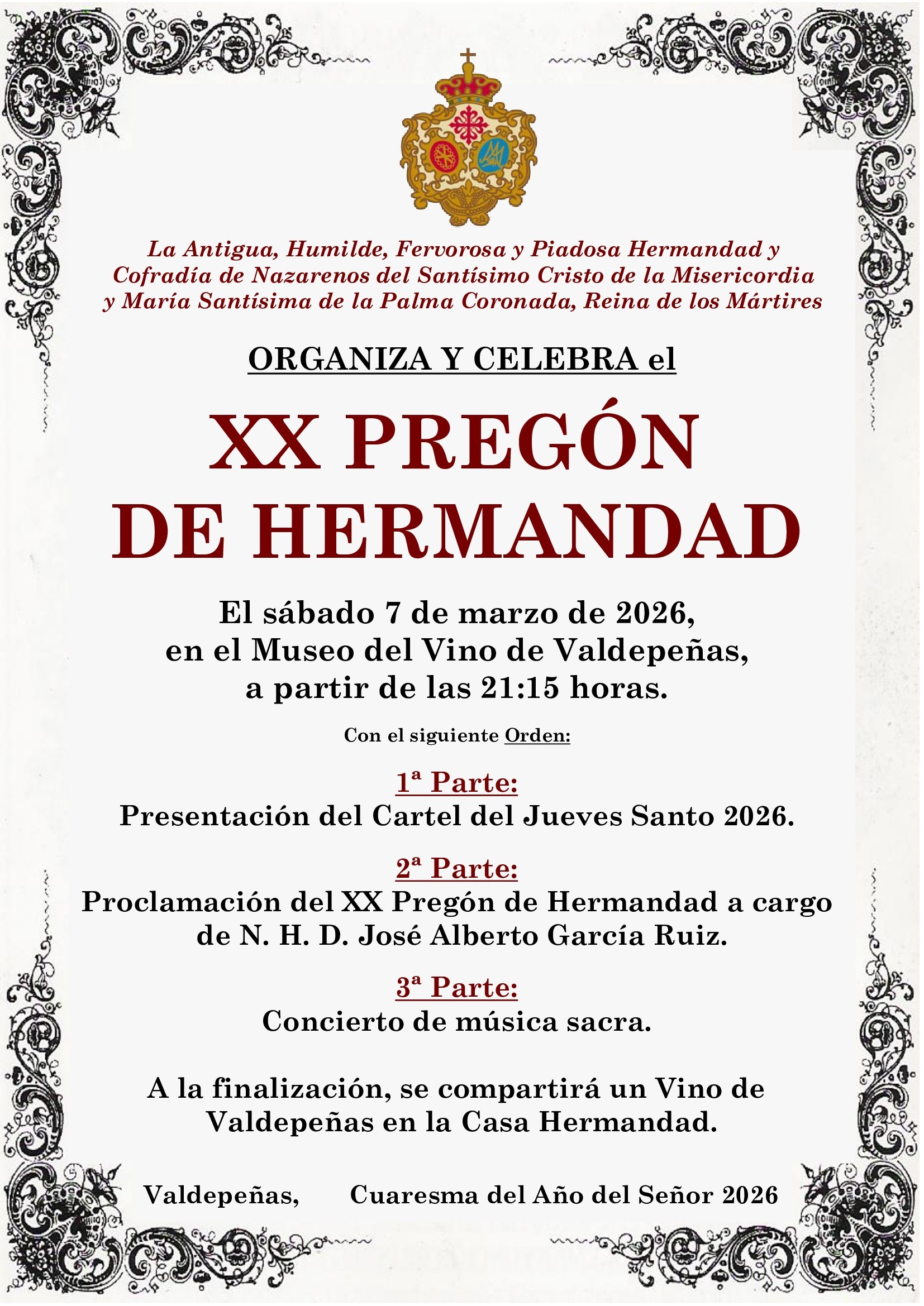 XX Pregón de Hermandad y Presentación del cartel del Jueves Santo 2026. Sábado, 7 de marzo, 21:15 h. Museo del Vino